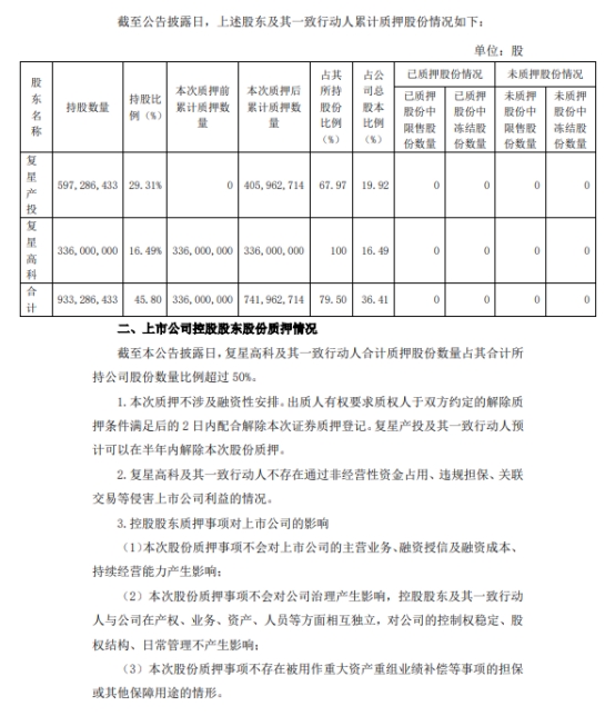 本次質(zhì)押不涉及融資性安排。出質(zhì)人有權(quán)要求質(zhì)權(quán)人于雙方約定的解除質(zhì)押條件滿足后的2日內(nèi)配合解除本次證券質(zhì)押登記。復(fù)星產(chǎn)投及其一致行動人預(yù)計可以在半年內(nèi)解除本次股份質(zhì)押。