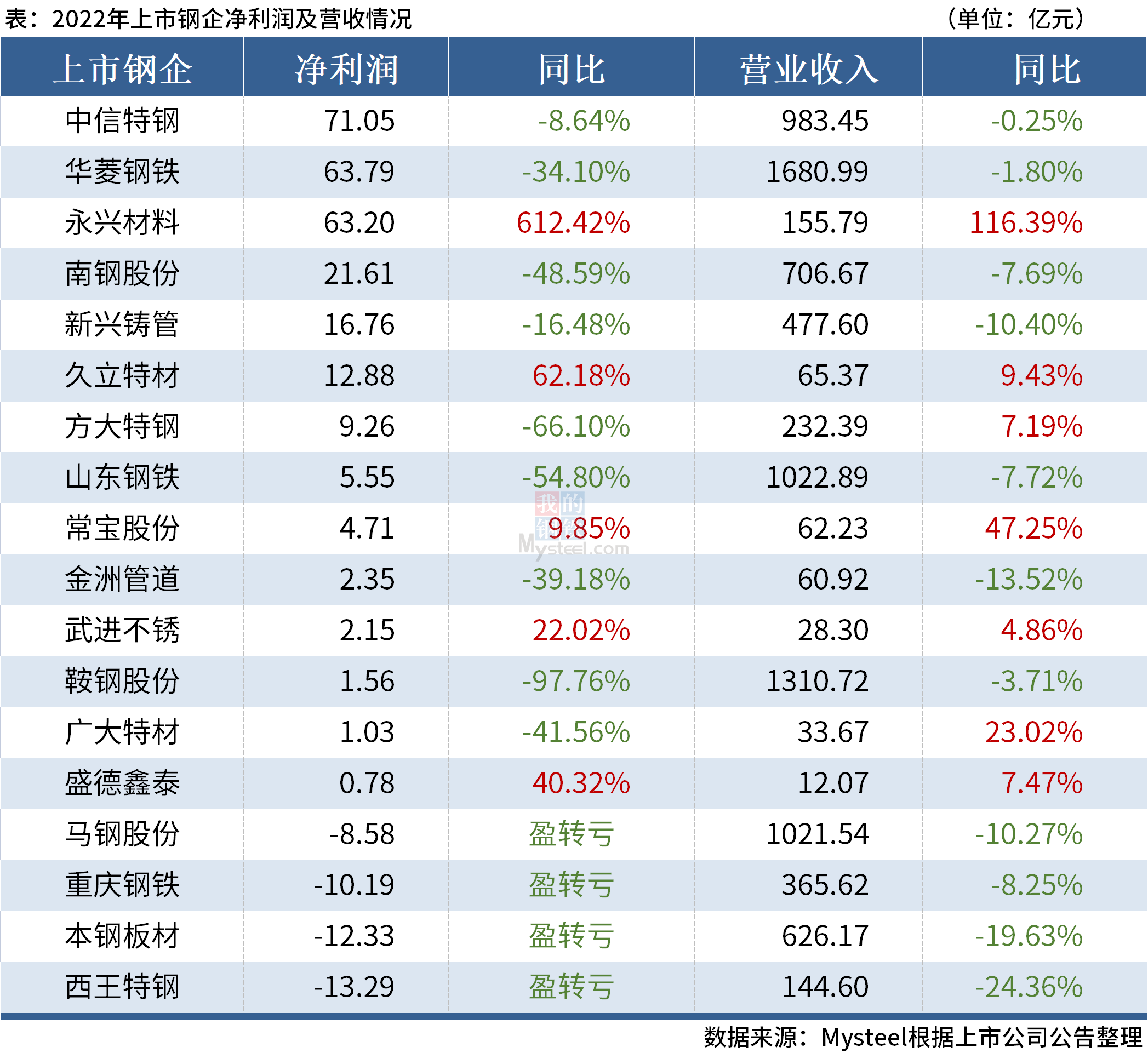 從凈利潤同比來看,僅5家鋼企2022年凈利潤同比實現(xiàn)正增長。其中,永興材料凈利潤增超6倍,同比增長612.42%。