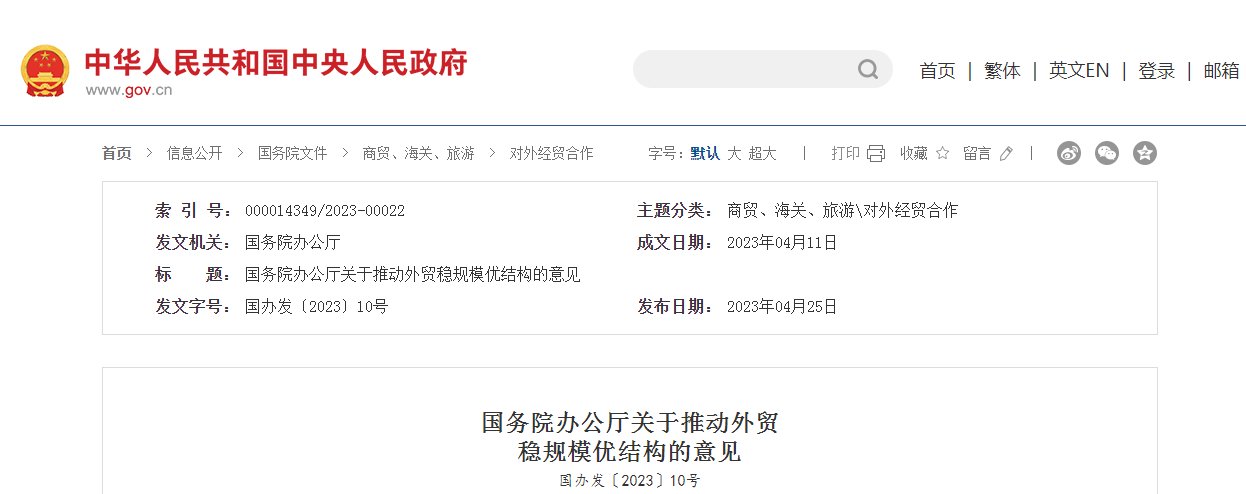 外貿(mào)是國民經(jīng)濟的重要組成部分,推動外貿(mào)穩(wěn)規(guī)模優(yōu)結(jié)構(gòu),對穩(wěn)增長穩(wěn)就業(yè)、構(gòu)建新發(fā)展格局、推動高質(zhì)量發(fā)展具有重要支撐作用。為全面貫徹落實黨的二十大精神,更大力度推動外貿(mào)穩(wěn)規(guī)模優(yōu)結(jié)構(gòu),確保實現(xiàn)進出口促穩(wěn)提質(zhì)目標任務(wù),經(jīng)國務(wù)院同意,現(xiàn)提出以下意見: