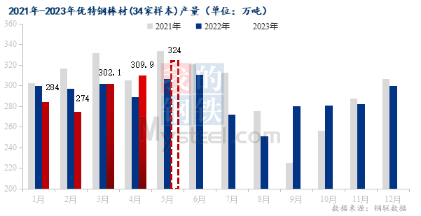 4月全國優(yōu)特鋼棒材(34家樣本)產(chǎn)量309.9萬噸,環(huán)比增加7.8萬噸,同比增加20.7萬噸;5月預計產(chǎn)量324萬噸,環(huán)比增加14.1萬噸,同比增加17.17萬噸;