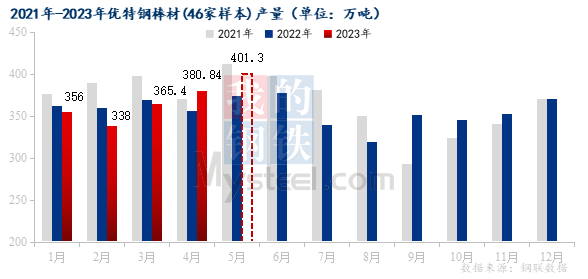 4月全國優(yōu)特鋼棒材(46家樣本)產(chǎn)量380.84萬噸,環(huán)比增加15.44萬噸,同比增加23.94萬噸;5月預計產(chǎn)量401.3萬噸,環(huán)比增加20.46萬噸,同比增加26.57萬噸。