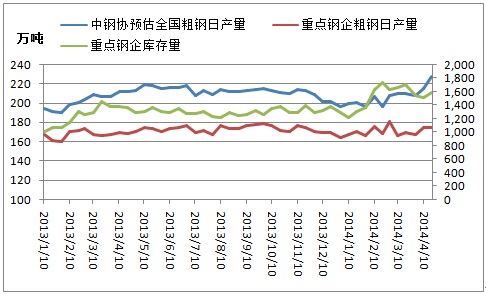 圖一:重點鋼企旬度粗鋼日產量及庫存量走勢