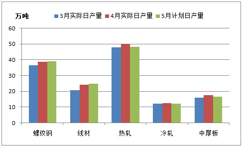 5月份全國鋼鐵產量預計繼續(xù)高位運行,其中建筑鋼材的供應壓力繼續(xù)加大。據(jù)我的鋼鐵網(wǎng)統(tǒng)計國內129家鋼企生產情況,2014年5月份螺紋鋼計劃日均產量39萬噸,較4月實際日產量增長0.78%;線材計劃日均產量24.1萬噸,較4月實際日產量增長3.32%;熱軋計劃日均產量49.96萬噸,較4月實際日產量下降3.52%;冷軋計劃日產量12.7萬噸,較4月實際日產量下降2.36%;中厚板計劃產量17.5萬噸,較4月實際日產量下降5.14%。