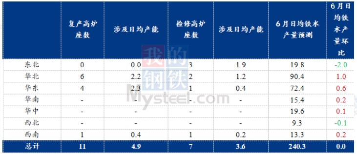 據(jù)Mysteel調(diào)研了解,6月有11座高爐計劃復(fù)產(chǎn),涉及產(chǎn)能約4.8萬噸/天;有7座高爐計劃停檢修,涉及產(chǎn)能約3.61萬噸/天。若按照目前統(tǒng)計到的停復(fù)產(chǎn)計劃生產(chǎn),預(yù)計6月日均鐵水產(chǎn)量240.3萬噸/天。