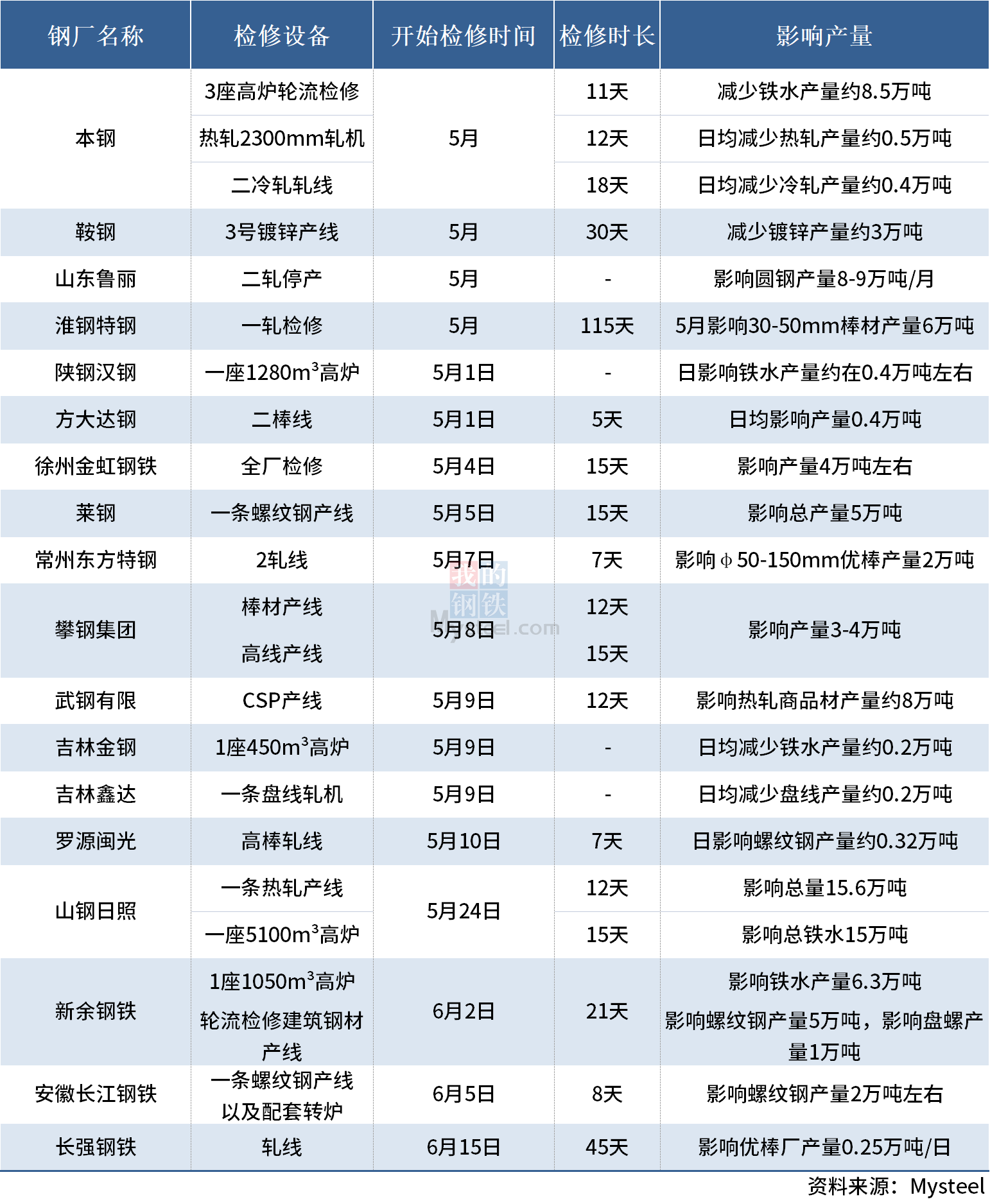 5-6月鋼廠停產(chǎn)檢修及生產(chǎn)情況