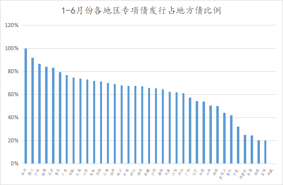 再?gòu)母鞯貐^(qū)1-6月發(fā)行的專項(xiàng)債占地方債總額的比例來看, 深圳、廈門和寧波三個(gè)計(jì)劃單列市的專項(xiàng)債發(fā)行占比最高,其中深圳上半年全部發(fā)行的是專項(xiàng)債,廈門為91%、寧波為86%。全國(guó)36個(gè)省區(qū)市加上建設(shè)兵團(tuán),有13個(gè)地區(qū)在上半年的專項(xiàng)債發(fā)行占比超過70%,低于50%的地區(qū)則有7個(gè)。