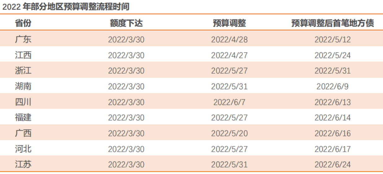 不過,需要注意的是,新增地方債額度下達(dá)與債券發(fā)行之間有一定時(shí)滯。地方在獲得新增額度后,需要進(jìn)行項(xiàng)目匹配、預(yù)算調(diào)整方案編寫、人大批準(zhǔn)等流程后方可發(fā)債,過程中可能會(huì)有1-2個(gè)月的時(shí)滯。此外,從預(yù)算調(diào)整到此后發(fā)行首筆地方債之間亦有時(shí)滯。以2022年為例,廣東已經(jīng)是這套流程耗時(shí)較短的省份,但從額度下達(dá)到預(yù)算調(diào)整后發(fā)行首批地方債,亦經(jīng)歷了近一個(gè)半月。