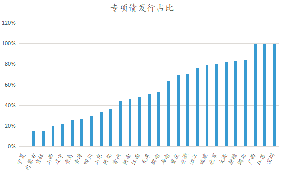 按品種劃分,6月份,14個(gè)地區(qū)發(fā)行的專項(xiàng)債占比超過50%。其中,深圳、江蘇和廣西三地6月全部發(fā)行的是專項(xiàng)債,而寧夏只發(fā)行了一期一般債券。