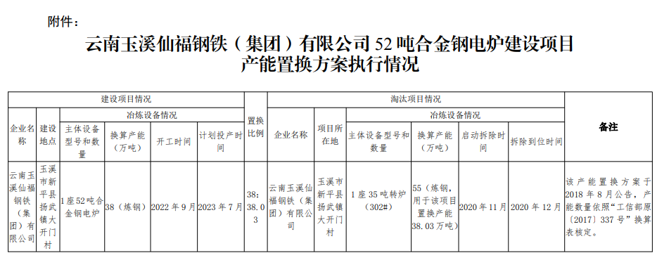 附件:云南玉溪仙福鋼鐵(集團)有限公司52噸合金鋼電爐建設項目產能置換方案執(zhí)行情況