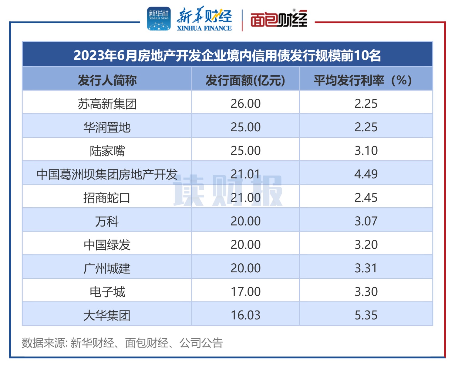 2023年6月,在新發(fā)行境內(nèi)信用債的房企中,蘇高新集團(tuán)發(fā)行信用債融資最多,金額為26億元,平均票面利率為2.25%;隨后為華潤(rùn)置地和陸家嘴,融資金額均為25億元,平均票面利率分別為2.25%、3.1%。