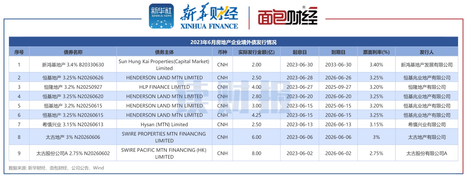 按照起息日口徑統(tǒng)計(jì),2023年6月,國(guó)內(nèi)房地產(chǎn)開(kāi)發(fā)企業(yè)共發(fā)行9筆境外債,均為離岸人民幣債券,融資金額為35.05億元。