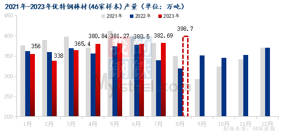 7月全國優(yōu)特鋼棒材(46家樣本)產(chǎn)量382.7萬噸,環(huán)比增加2.2萬噸,同比增加43.1萬噸;8月預(yù)計(jì)產(chǎn)量398.7萬噸,環(huán)比增加16.0萬噸,同比增加79.1萬噸。