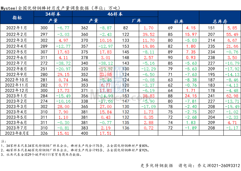 7月全國優(yōu)特鋼棒材(34家樣本)產(chǎn)量309.9萬噸,環(huán)比減少0.8萬噸,同比增加37.7萬噸;8月預(yù)計(jì)產(chǎn)量325.5萬噸,環(huán)比增加15.6萬噸,同比增加74.3萬噸;