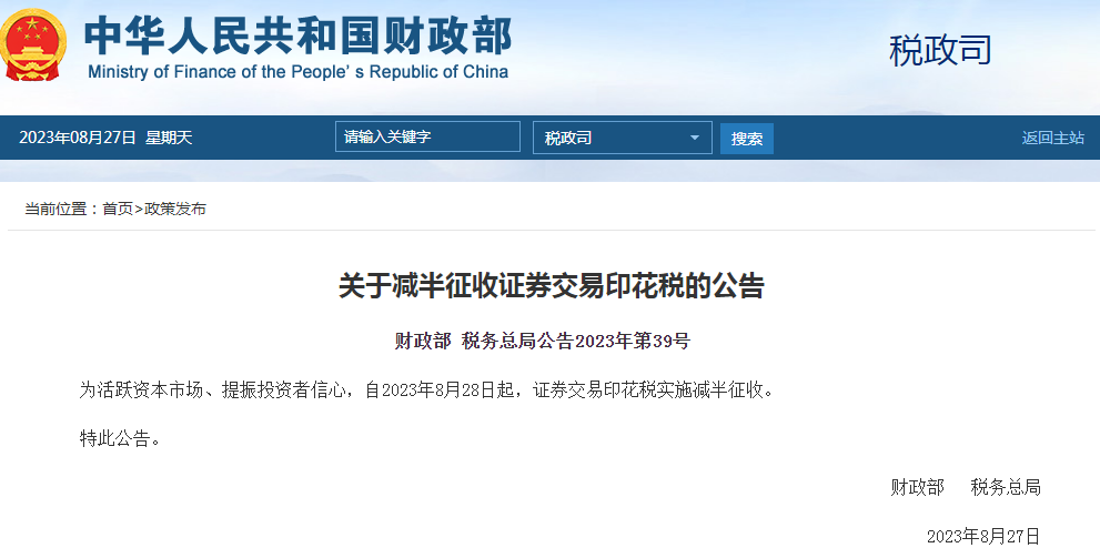 8月27日,財(cái)政部、國家稅務(wù)總局聯(lián)合發(fā)布公告,為活躍資本市場、提振投資者信心,自2023年8月28日起,證券交易印花稅實(shí)施減半征收。