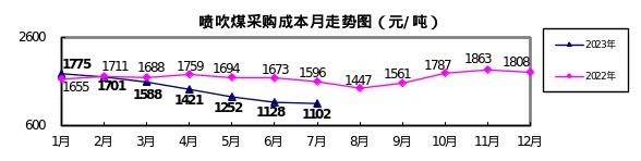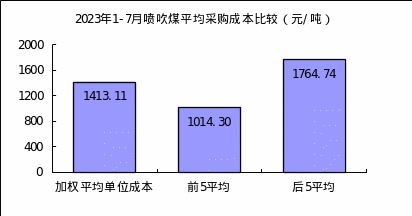 噴吹煤7月份加權(quán)平均折算成干基的采購成本為1102.14元/噸,環(huán)比下降26.25元/噸,降幅為2.33%。1—7月累計平均折算成干基的采購成本為1413.11元/噸,同比下降248.44元/噸,降幅為14.95%。