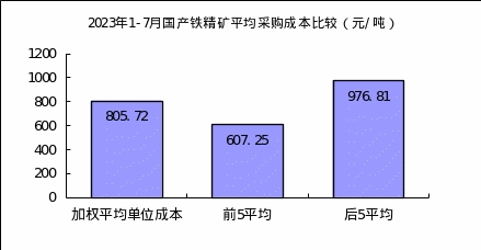 1—7月對標企業(yè)國產(chǎn)鐵精礦折算成62%品位的平均采購成本為805.72元/噸,成本最低的前5家企業(yè)的加權(quán)平均采購成本為607.25元/噸,比對標企業(yè)平均采購成本低198.47元/噸,低于平均采購成本24.63%;而采購成本最高的5家企業(yè)的加權(quán)平均采購成本為976.81元/噸,比對標企業(yè)平均采購成本高171.09元/噸,高于平均采購成本21.24%。