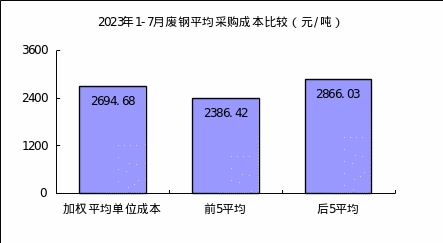 1—7月對標企業(yè)廢鋼平均采購成本最低的前5家企業(yè)的加權(quán)平均采購成本為2386.42元/噸,比對標企業(yè)平均采購成本低308.26元/噸,低于平均采購成本11.44%;而采購成本最高的5家企業(yè)加權(quán)平均采購成本為2866.03元/噸,比對標企業(yè)平均采購成本高171.35元/噸,高于平均采購成本6.36%。