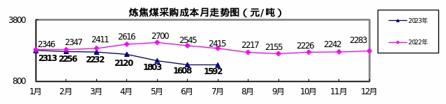 對標企業(yè)煉焦煤7月份加權(quán)平均折算成干基的采購成本為1592.43元/噸,環(huán)比下降15.62元/噸,降幅為0.97%。1—7月累計平均折算成干基的采購成本為1984.74元/噸,同比下降496.85元/噸,降幅為20.02%。