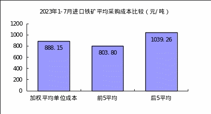 進口粉礦7月份加權(quán)平均采購成本845.42元/噸,環(huán)比升高25.70元/噸,升幅為3.13%。1—7月累計平均采購成本為857.27元/噸,同比下降32.98元/噸,降幅為3.70%。