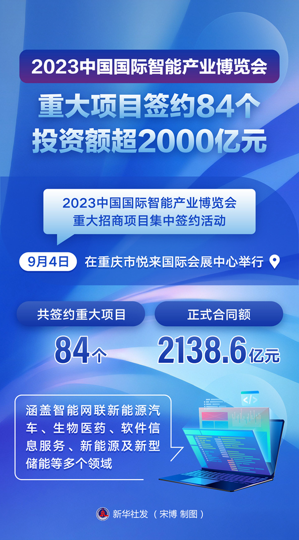 2023中國國際智能產(chǎn)業(yè)博覽會重大招商項目集中簽約活動4日在重慶市悅來國際會展中心舉行,共簽約重大項目84個,正式合同額2138.6億元,涵蓋智能網(wǎng)聯(lián)新能源汽車、生物醫(yī)藥、軟件信息服務(wù)、新能源及新型儲能等多個領(lǐng)域。