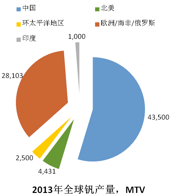 根據(jù)統(tǒng)計數(shù)據(jù)顯示,盡管2013年全球鋼鐵工業(yè)出現(xiàn)了疲軟態(tài)勢,但釩產(chǎn)量出現(xiàn)了反彈,從2011年的76,166噸金屬釩,2012的71,289噸反彈至79,534噸。