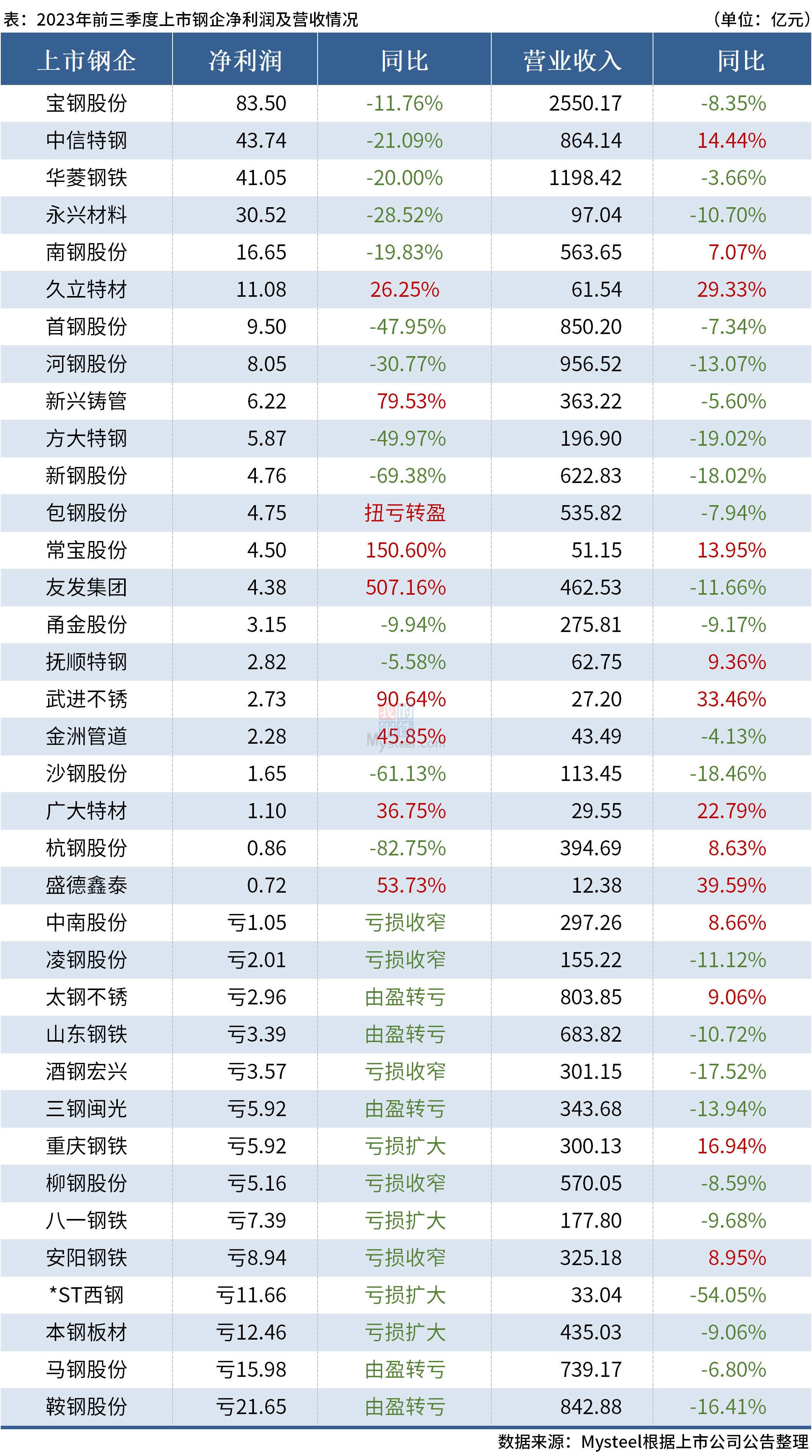 據(jù)Mysteel統(tǒng)計,36家上市鋼企公布2023年前三季度業(yè)績報告,合計營業(yè)收入約16341.71億元,合計凈利潤約181.82億元。