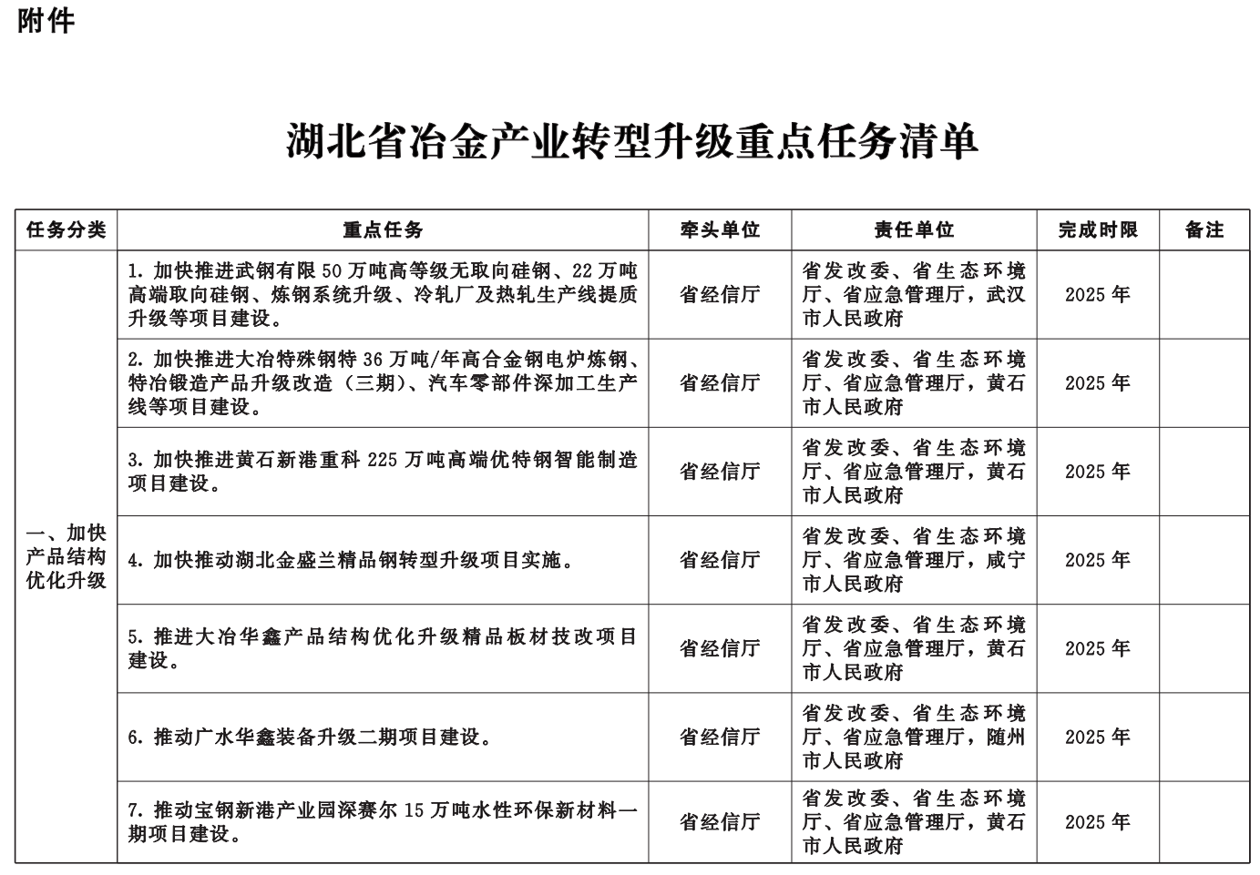 附件:湖北省冶金產(chǎn)業(yè)轉(zhuǎn)型升級重點任務(wù)清單