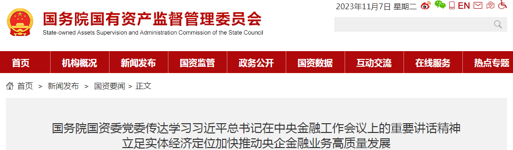 會議認為,習近平總書記在中央金融工作會議上的重要講話,全面總結黨的十八大以來金融工作,系統(tǒng)分析金融高質量發(fā)展面臨的形勢,科學回答了金融事業(yè)發(fā)展的一系列重大理論和實踐問題,首次明確提出加快建設金融強國的目標,是習近平經(jīng)濟思想的重要組成部分,是馬克思主義政治經(jīng)濟學關于金融問題的重要創(chuàng)新成果,為新時代新征程推動金融高質量發(fā)展提供了根本遵循和行動指南。要切實提高站位、強化擔當,從堅定擁護“兩個確立”、堅決做到“兩個維護”的政治高度,全面領會黨的十八大以來我國金融事業(yè)發(fā)展取得新的重大成就、走好中國特色金融發(fā)展之路的基本要義、我國金融高質量發(fā)展面臨的形勢任務、優(yōu)化金融服務的方向目標、加強金融監(jiān)管的部署要求、加強黨對金融工作的全面領導的重大要求,切實把思想和行動統(tǒng)一到習近平總書記重要講話精神和黨中央決策部署上來,大力推動金融改革發(fā)展穩(wěn)定各項任務在國資央企落實落細落到位。