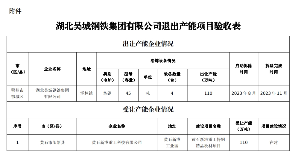 2022年5月27日省經(jīng)信廳發(fā)布的《湖北吳城鋼鐵集團(tuán)有限公司產(chǎn)能出讓方案公告》(〔2022〕年第6號(hào)),出讓的110萬(wàn)噸煉鋼產(chǎn)能指標(biāo)所屬冶煉設(shè)備(45噸電爐4臺(tái))已按《鋼鐵行業(yè)產(chǎn)能置換實(shí)施辦法》要求完成拆除,通過(guò)省級(jí)驗(yàn)收。