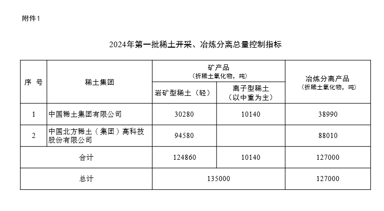 附件:1.2024年第一批稀土開采、冶煉分離總量控制指標(biāo)