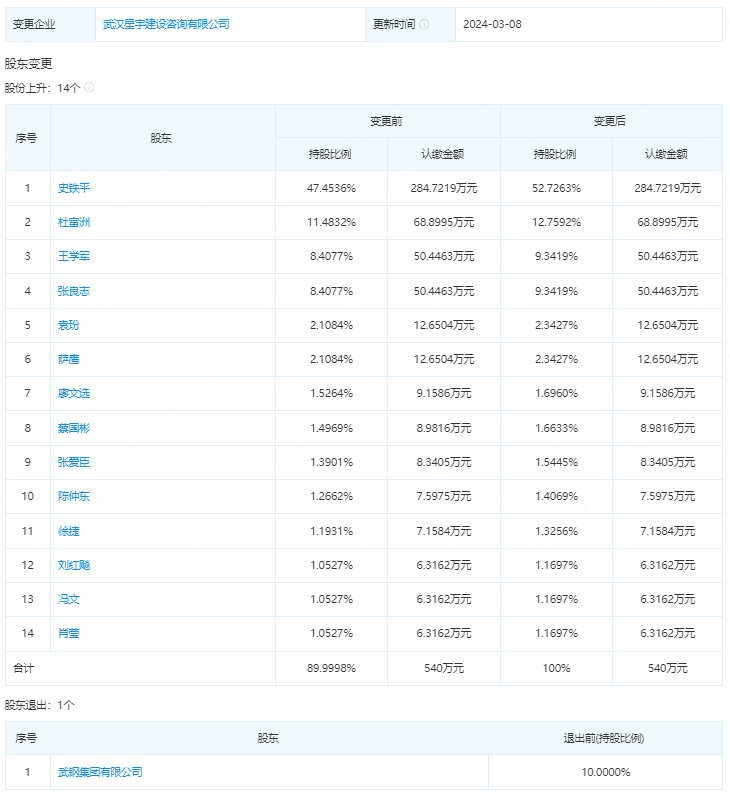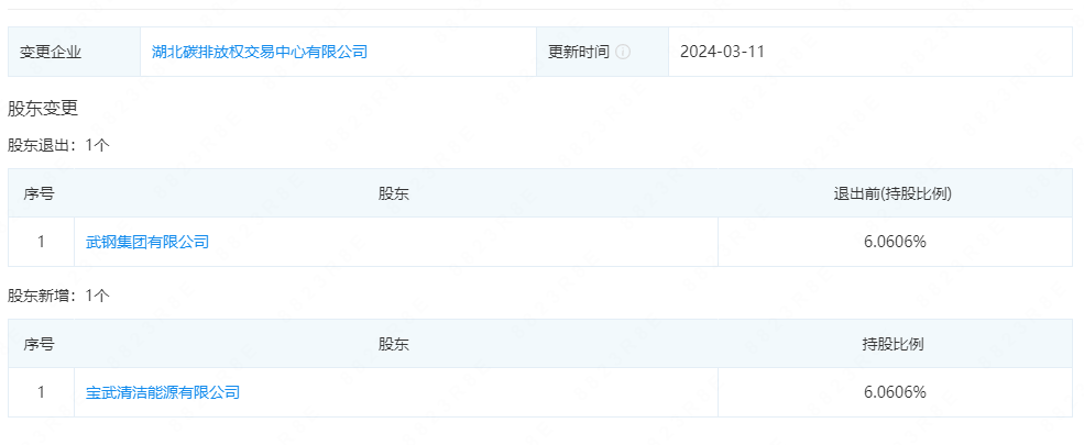 近日,據(jù)企查查顯示,武鋼集團(tuán)有限公司連續(xù)退出兩家對(duì)外投資企業(yè),分別是湖北碳排放權(quán)交易中心有限公司和武漢星宇建設(shè)咨詢有限公司,具體情況如下: