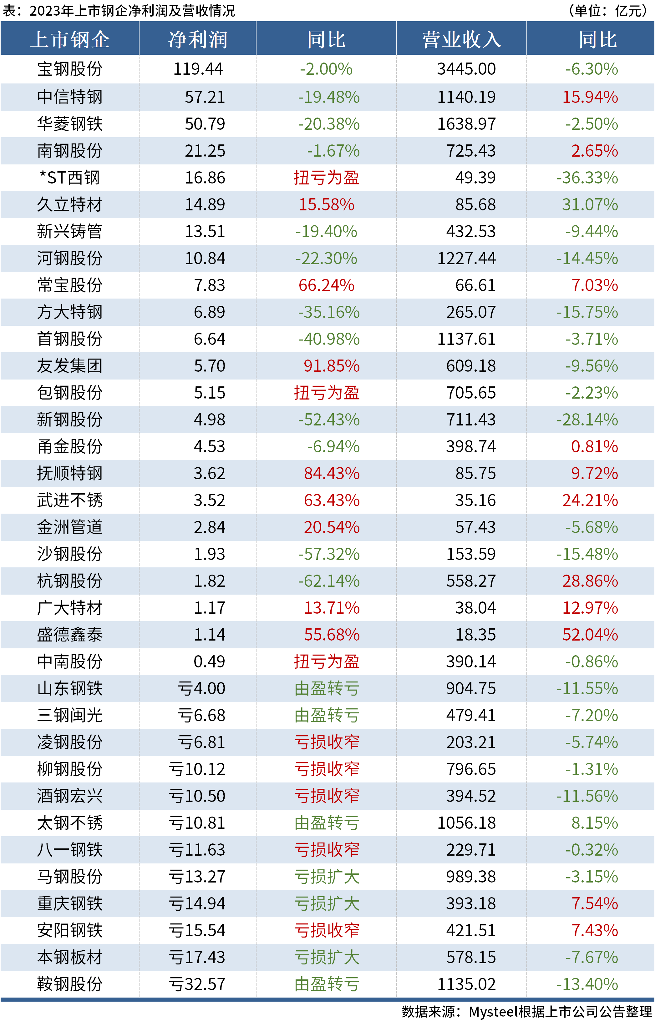 據(jù)Mysteel統(tǒng)計(jì),已有35家上市鋼企公布2023年度業(yè)績(jī),合計(jì)營(yíng)業(yè)收入21557.32億元,合計(jì)凈利潤(rùn)208.74億元。