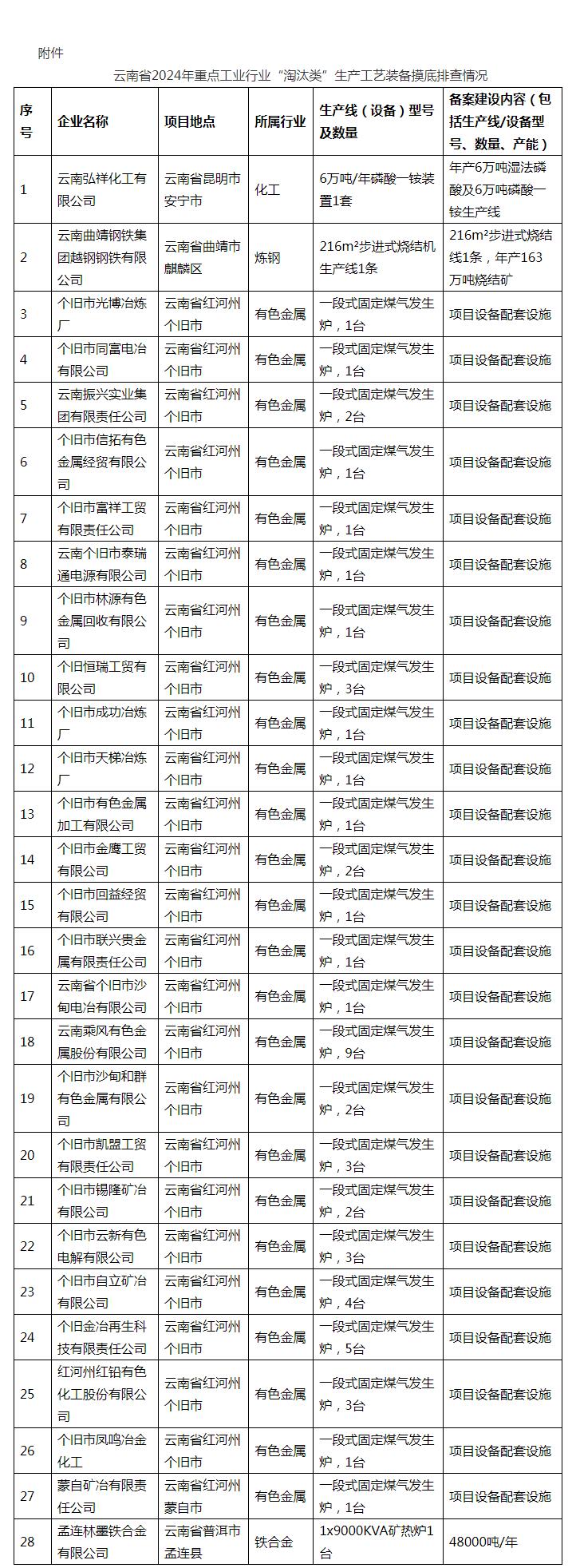 附件:云南省2024年重點工業(yè)行業(yè)“淘汰類”生產(chǎn)工藝裝備摸底排查情況