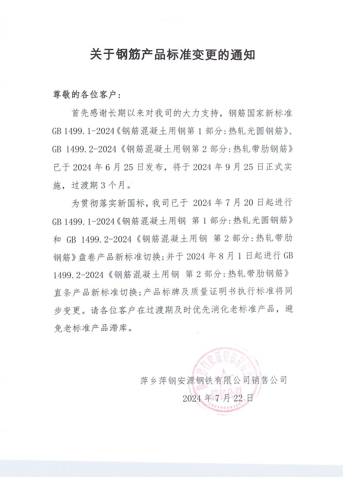 首先感謝長期以來對我司的大力支持,鋼筋國家新標(biāo)準(zhǔn)GB1499.1-2024《鋼筋混凝土用鋼第1部分:熱軋光圓鋼筋》GB 1499.2-2024《鋼筋混凝土用鋼第2部分:熱軋帶肋鋼筋》已于2024年6月25 日發(fā)布,將于2024年9月25日正式實施,過渡期3個月。