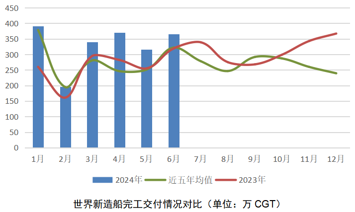 新接與完工同比漲幅超兩成。新接訂單方面,1-6月世界新造船市場(chǎng)成交2920萬(wàn)CGT,同比增長(zhǎng)27.6%,比近五年同期成交均值(2019-2023)增長(zhǎng)49%。其中,6月當(dāng)月成交718萬(wàn)CGT,創(chuàng)下本輪市場(chǎng)復(fù)蘇以來(lái)的單月最高成交量。以DWT計(jì),1-6月世界成交新船7256萬(wàn)DWT,同比增長(zhǎng)39.9%。完工交付方面,1-6月世界新造船交付1979萬(wàn)CGT,累積同比增加25.9%,較近5年均值高出18.3%。截至6月底,世界手持訂單1.34億CGT,同比增長(zhǎng)3.4%。數(shù)據(jù)反映出今年新造船市場(chǎng)延續(xù)了向好勢(shì)頭,產(chǎn)能潛力不斷釋放,全年市場(chǎng)指標(biāo)有望再創(chuàng)新高。