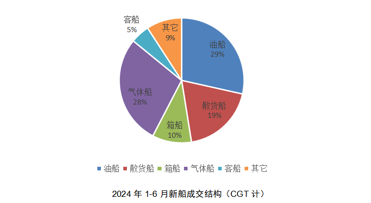 油船、氣體船、散貨船成交份額位居前三。2024年1-6月,以CGT計(jì),成交船型結(jié)構(gòu)依次為油船(29%)、氣體船(28%)、散貨船(19%)、集裝箱船(10%)、其它船舶(9%)以及客船(5%)等。主力船型成交同比變化中,氣體船、油船、客船保持同比增長(zhǎng),散貨船、集裝箱船、其它等船型同比下降。油船訂單依然保持可觀增速,繼續(xù)支持了新造船市場(chǎng)穩(wěn)定增長(zhǎng)。隨著卡氣項(xiàng)目訂單持續(xù)釋放以及大型LNG運(yùn)輸船的更新需求,今年以來(lái)大型LNG運(yùn)輸船、VLAC等大型氣體船等氣體船訂單的份額占比較大。另外,客船市場(chǎng)明顯回暖,大型郵輪市場(chǎng)訂單不斷釋放,同比增長(zhǎng)大幅提高。