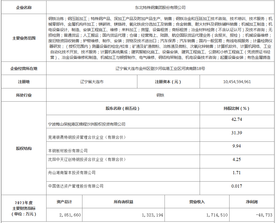 東北特鋼于2018年10月12日在大連市工商行政管理局登記注冊(cè),注冊(cè)資本金10,377,358,490元人民幣,注冊(cè)地址為遼寧省大連市金州區(qū)登沙河臨港工業(yè)區(qū)河濱南路18號(hào),公司類型為其他股份有限公司(非上市),法定代表人龔盛,經(jīng)營(yíng)范圍包括鋼鐵冶煉;鋼壓延加工;特殊鋼產(chǎn)品、深加工產(chǎn)品及附加產(chǎn)品生產(chǎn)、銷售;鋼鐵冶金和壓延加工技術(shù)咨詢、技術(shù)培訓(xùn)、技術(shù)服務(wù);機(jī)械零部件、金屬機(jī)構(gòu)件加工;鎂碳磚、鎂鉻磚、氧化鐵皮分選加工及銷售;合金銷售、耐火材料及鋼鐵輔料等。2020年7月24日,東北特鋼注冊(cè)資本增加為10,454,594,961元,股東總數(shù)增加至185家。