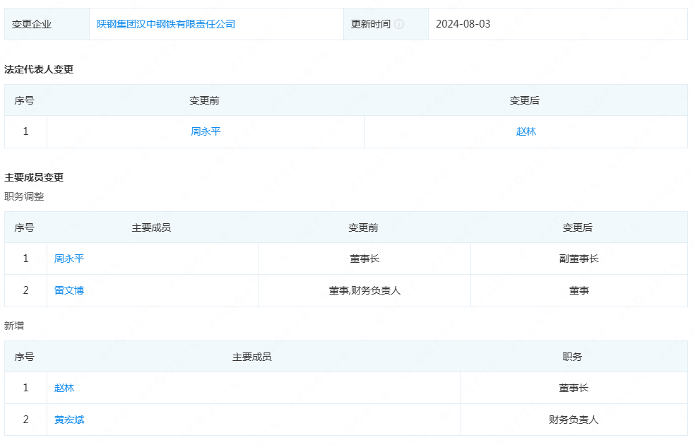 同時(shí),據(jù)企查查顯示,陜鋼集團(tuán)漢鋼公司法定代表人以及主要成員也發(fā)生了相應(yīng)的調(diào)整,具體情況如下: