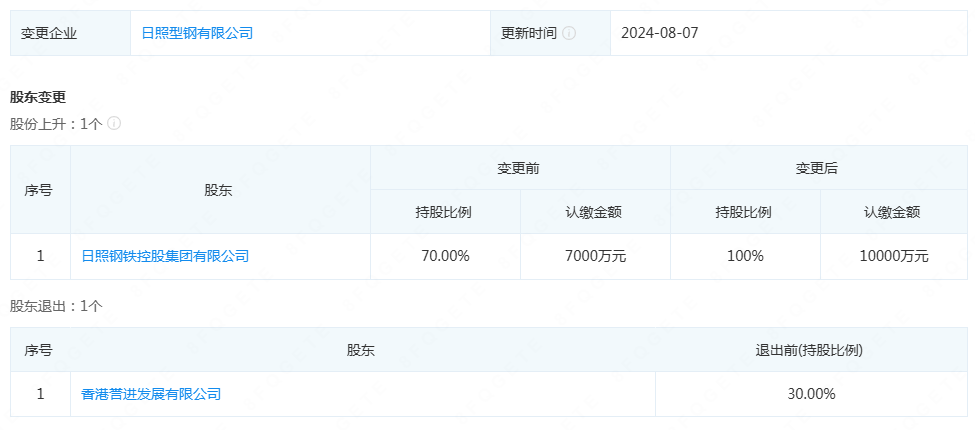 8月7日,據(jù)企查查顯示,日照鋼鐵控股集團有限公司在日照型鋼有限公司的持股比例上升,從70%增加到100%,日照型鋼有限公司成為日照鋼鐵控股集團有限公司100%控股子公司,具體情況如下: