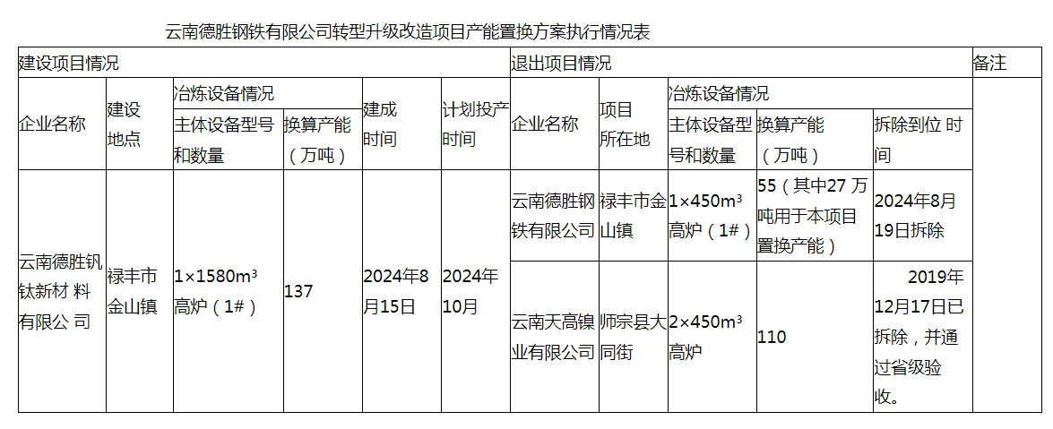 云南德勝鋼鐵有限公司轉(zhuǎn)型升級改造項目產(chǎn)能置換方案執(zhí)行情況公告