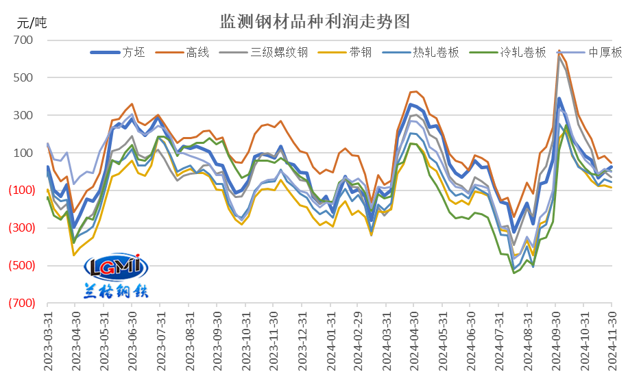 以四周庫存原料測(cè)算各品種的毛利表現(xiàn)來看,11月份四周庫存原料測(cè)算品種毛利呈現(xiàn)低位波動(dòng)態(tài)勢(shì),月均盈利明顯下降;蘭格鋼鐵研究中心監(jiān)測(cè)數(shù)據(jù)顯示,監(jiān)測(cè)的七大品種月均盈利中,帶鋼、熱軋卷板、冷軋卷呈現(xiàn)虧損狀態(tài),虧損幅度在5-70元之間;其他品種仍有一定盈利,盈利幅度在8-93元,較上月大幅收窄。