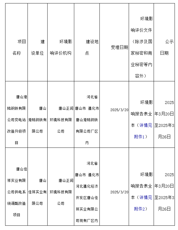 唐山港陸鋼鐵有限公司變電站改造升級項目等2個項目環(huán)境影響報告表受理情況公示(核與輻射類)