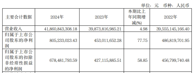 甬金股份4月9日晚間發(fā)布年度業(yè)績報(bào)告稱,2024年?duì)I業(yè)收入約418.61億元,同比增加4.98%;歸屬于上市公司股東的凈利潤約8.05億元,同比增加77.75%;基本每股收益2.19元,同比增加78.05%。