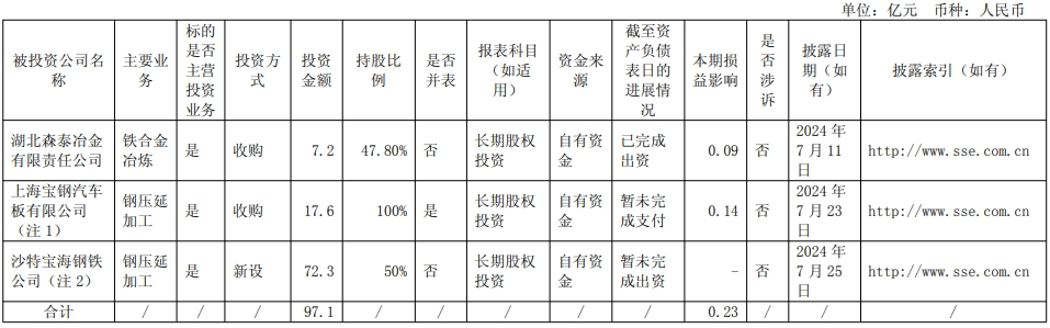 2024 年寶鋼日鐵汽車板有限公司合營(yíng)期限屆滿,公司收購(gòu)日方股東日本制鐵所持全部股權(quán),收購(gòu)?fù)瓿珊?,其成為公司下屬全資子公司,并更名為上海寶鋼汽車板有限公司。截至2024 年年末,公司擁有其 100%股權(quán),該公司注冊(cè)資本人民幣 30 億元,主要經(jīng)營(yíng)范圍為生產(chǎn)、銷售用于汽車、汽車零部件的冷軋鋼板和熱鍍鋅鋼板,并從事與上述業(yè)務(wù)相關(guān)的附帶業(yè)務(wù),共632 名員工。截至2024年年末,該公司總資產(chǎn)為 64.0 億元,凈資產(chǎn)為 39.0 億元,全年實(shí)現(xiàn)凈利潤(rùn)1.5 億元。