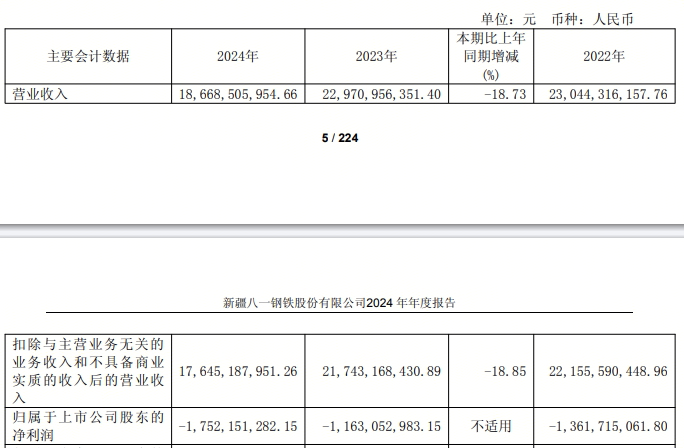 4月26日,八一鋼鐵發(fā)布2024年全年業(yè)績報告,2024年實現(xiàn)營業(yè)收入186.68億元,同比下降18.73%,營業(yè)成本190.07億元,同比下降13.96%,累計虧損 17.52 億元,同比增加虧損 5.89 億元。