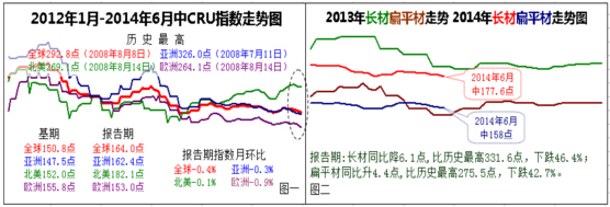 6月前半月的國際鋼市震蕩下行。月中,164點(diǎn)的CRU總指數(shù)月環(huán)比下跌0.4%(跌幅收斂)。其中:亞洲指數(shù)162.4點(diǎn),月環(huán)比下跌0.3%(跌幅收斂);歐洲指數(shù)153點(diǎn),月環(huán)比下跌0.9%,(跌幅擴(kuò)大);北美指數(shù)182.1%,月環(huán)比下跌0.1%(由漲轉(zhuǎn)跌);扁平材指數(shù)158點(diǎn),月環(huán)比下跌0.4%(跌幅收斂);長材指數(shù)177.6點(diǎn),月環(huán)比下跌0.5%(跌幅收斂)。CRU運(yùn)行態(tài)勢(shì)可見,經(jīng)過一段時(shí)間的震蕩運(yùn)行后,6月前半月的CRU指數(shù)全面下行,雖然歐亞地區(qū)的跌幅有所收斂,但全球鋼市持續(xù)走弱的態(tài)勢(shì)顯而易見。因此結(jié)合基本面情況預(yù)測(cè),近期全球鋼市將繼續(xù)震蕩下行走勢(shì)。(見下圖一、圖二)