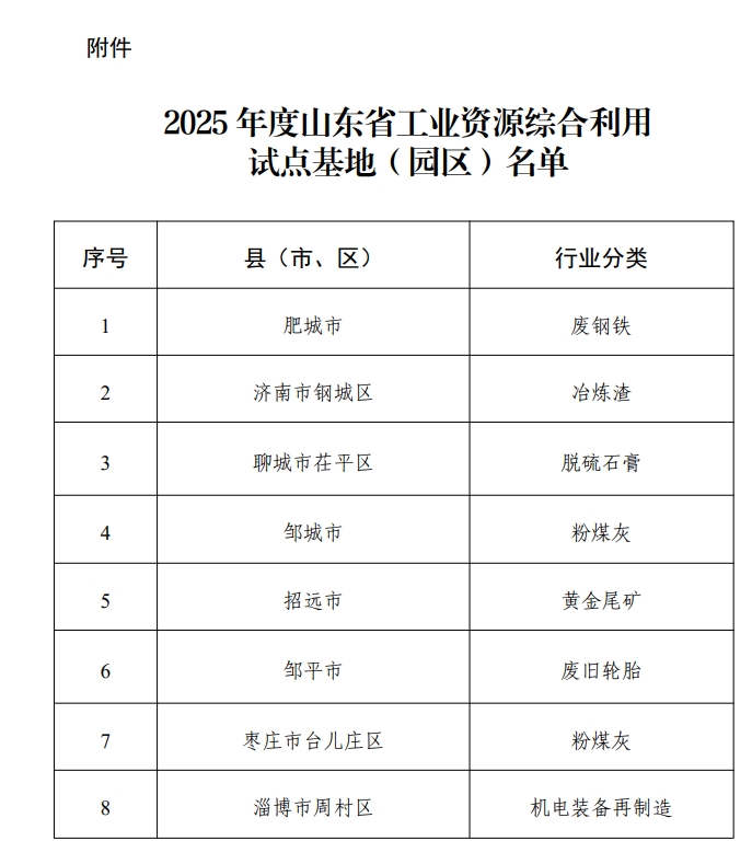 附件:2025年度山東省工業(yè)資源綜合利用試點(diǎn)基地(園區(qū))名單