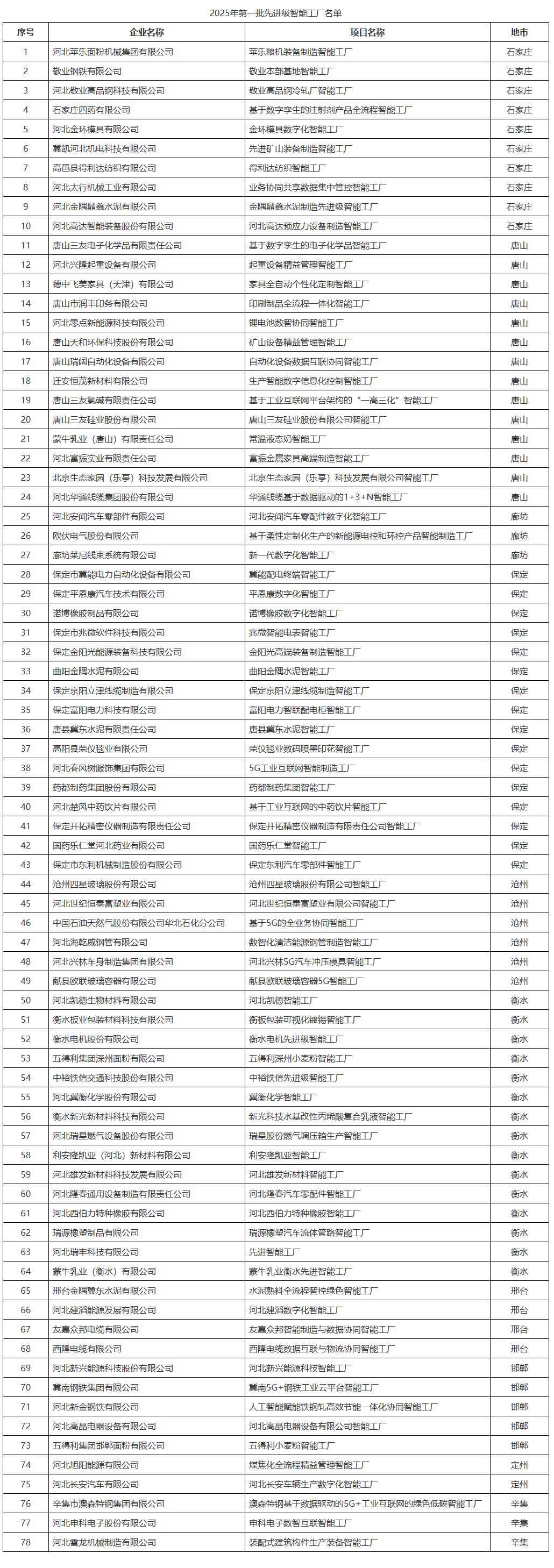 根據(jù)河北省工業(yè)和信息化廳《關(guān)于做好2025年度智能工廠梯度培育工作的通知》要求,按照培育程序,決定將“蘋(píng)樂(lè)糧機(jī)裝備制造智能工廠”等78個(gè)智能工廠認(rèn)定為2025年第一批先進(jìn)級(jí)智能工廠(名單見(jiàn)附件)。