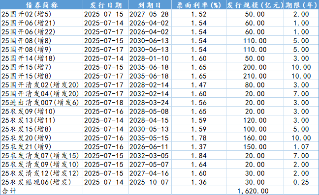 具體來看,國債方面,財政部上周發(fā)行5只國債,環(huán)比減少1只,發(fā)行規(guī)模共2,433.10億元,環(huán)比減少499億元。從具體品種來看,上周財政部發(fā)行了3只貼現(xiàn)債和2只超長期特別國債(下表)。
