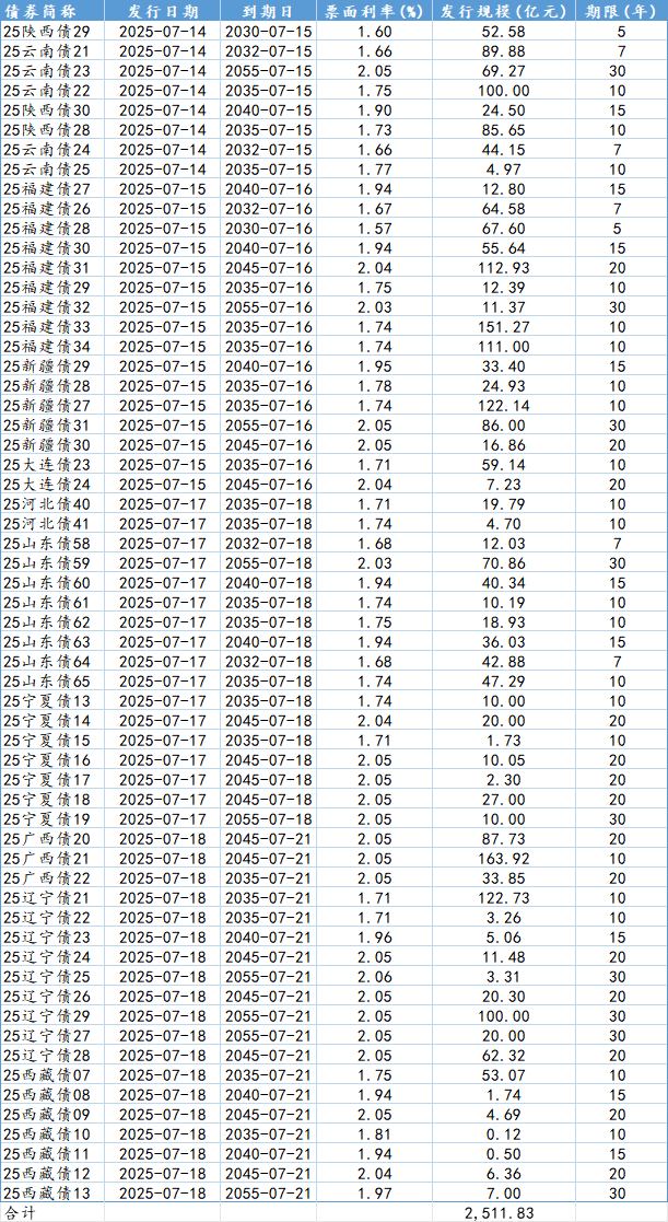 上周,陜西、新疆、大連等地發(fā)行60只地方債,環(huán)比增加15只,總規(guī)模2,511.83億元,環(huán)比增加193.93億元(下表)。